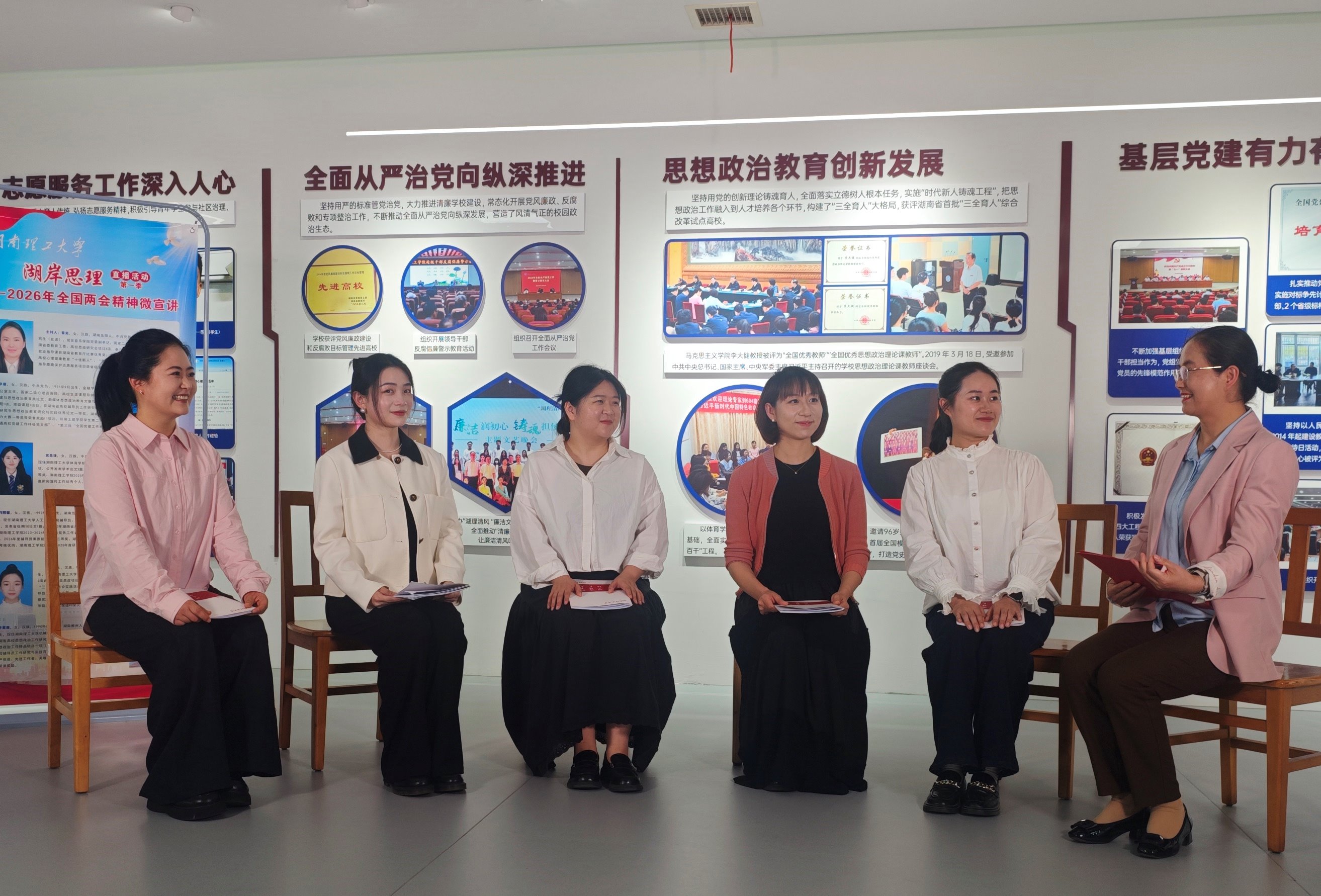 校园网讯 4月28日,由党委宣传部、学工部、音乐学院党委联合主办,“湖岸思理”辅导员成长赋能团队承办的“湖岸思理”直播活动第一季——2026年全国两会精神微宣讲顺利开播。来自学校体育学院、土木建筑工程学院、人工智能学院、数学学院、机械工程学院的六位辅导员代表依次开讲,吸引线上5000余名观众观看,收获点赞20000+。本次微宣讲紧扣2026年全国两会精神核心要义,围绕体育强国、乡村振兴、科技报国、志愿服务、匠心筑梦...